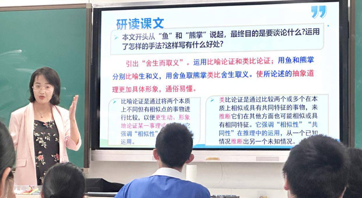 课堂开始,闫敬霞书记回归教学本源,带领同学们深入文本。她从“鱼”与“熊掌”的类比论证入手,引导学生思考历史和生活中的种种选择,深入理解“舍生而取义”的深层含义,理解“人人固有的善良本心,是恻隐、羞恶、辞让、是非之心的发端”。