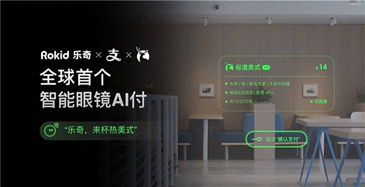 Rokid乐奇眼镜将新接入支付宝AI付,用户与眼镜助手对话时无需操作手机,即可通过语音说话完成从咖啡点单到支付的全流程。